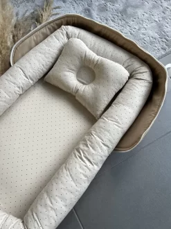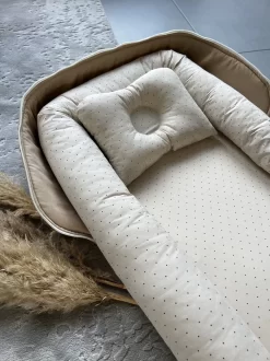 Dit model heeft zoals vele babynestjes opstaande randen die ervoor zorgen dat de baby niet uit het nestje kan rollen. Het stevige en zachte matrasje aan de onderkant geeft genoeg steun aan jouw baby. Aan het einde zit een klittenband waarmee je het voeteneinde open kunt maken en kan gebruiken als aankleedkussen of speelmatrasje voor oefeningen op de buik. Aan beide zijdes zijn vakken waar je bijvoorbeeld je sleutels en telefoon kan opbergen.