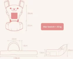 Gebruik: 0-36 maanden, max aanbevolen gewicht 20kg, het afneembare heupzitje biedt ongelooflijke veelzijdigheid tijdens de groei van je baby