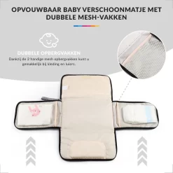 Met dit waterbestendige verschoonmatje kun je overal en ten alle tijden de luier van uw kind verschonen, of uw kind aankleden op het matje. De verschoonmat is ook voorzien van een luieretui en opbergvakjes voor babydoekjes of overige accessoires om mee te nemen. De opvouwbare verschoonmat is opgebouwd met 3 materiaallagen met een waterdichte stof aan de binnen en buitenkant, en is makkelijk opvouwbaar na gebruik door de handige en stevige klittenbandsluiting. Het matje is voorzien van een klein hoofdkussen voor de baby om zodoende een comfortabele ligging te garanderen voor uw baby. De verschoningsmat zorgt voor een hygiënische werking en hoeft u zich geen zorgen meer te maken om ergens anders uw baby te moeten verschonen.