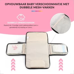 Met dit waterbestendige verschoonmatje kun je overal en ten alle tijden de luier van uw kind verschonen, of uw kind aankleden op het matje. De verschoonmat is ook voorzien van een luieretui en opbergvakjes voor babydoekjes of overige accessoires om mee te nemen. De opvouwbare verschoonmat is opgebouwd met 3 materiaallagen met een waterdichte stof aan de binnen en buitenkant, en is makkelijk opvouwbaar na gebruik door de handige en stevige klittenbandsluiting. Het matje is voorzien van een klein hoofdkussen voor de baby om zodoende een comfortabele ligging te garanderen voor uw baby. De verschoningsmat zorgt voor een hygiënische werking en hoeft u zich geen zorgen meer te maken om ergens anders uw baby te moeten verschonen.