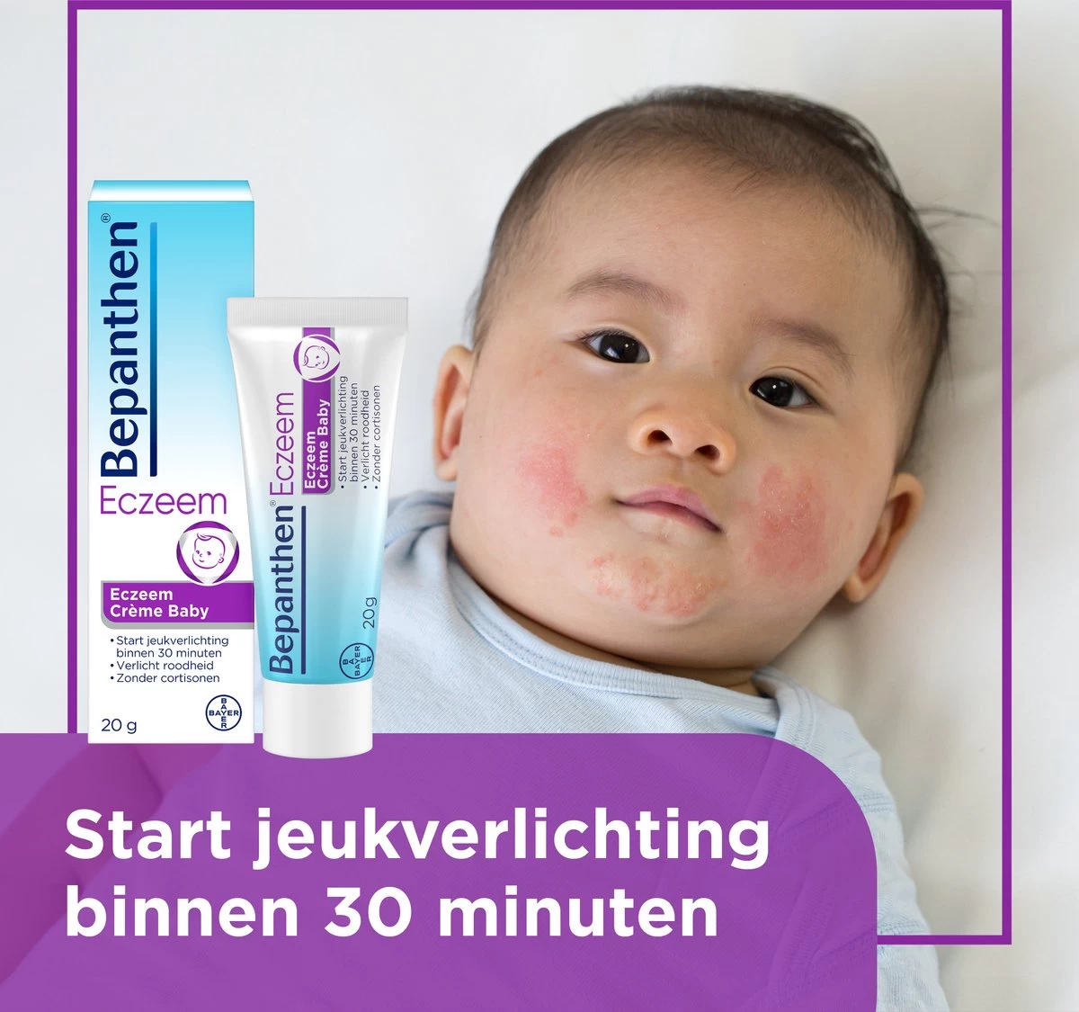 Bepanthen Eczeem Creme is er ook voor de allerkleinsten (te gebruiken vanaf de geboorte) en verkrijgbaar in een kleine variant van 20 gram in het babyschap en online. Bepanthen Eczeem Creme bevat geen cortisonen (hormonen) en parfum. Bepanthen Eczeem Creme verlicht effectief jeuk en roodheid bij licht tot matig atopisch eczeem op de babyhuid. Daarnaast ondersteunt de baby creme het huidherstel* bij huidirritatie, zoals eczeem (atopisch) of een allergische reactie op de babyhuid.