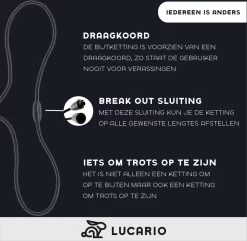 Wij willen dat onze bijtketting voor iedereen geschikt is en daarom hebben wij de break out-sluiting ontwikkeld. Met deze sluiting kun je de ketting op alle gewenste lengtes afstellen, waardoor die bij elke kauwer perfect aansluit op de nek. Om ervoor te zorgen dat de ketting niet ineens langer of korter wordt, is de sluiting gemaakt van sterk materiaal. Hierdoor verschuift de ingestelde lengte niet.