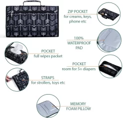 Met zijn snel te openen klittenbandsluiting, op maat gemaakte 100x doekjeszak, minimaal 5x luierzak en zak met ritssluiting – het draagbare luierverschoonkussen is de ENIGE pad waarmee u met één hand de baby kunt vasthouden, en de andere voor hun aankleedkussen voor een snelle, wendbare verandering!