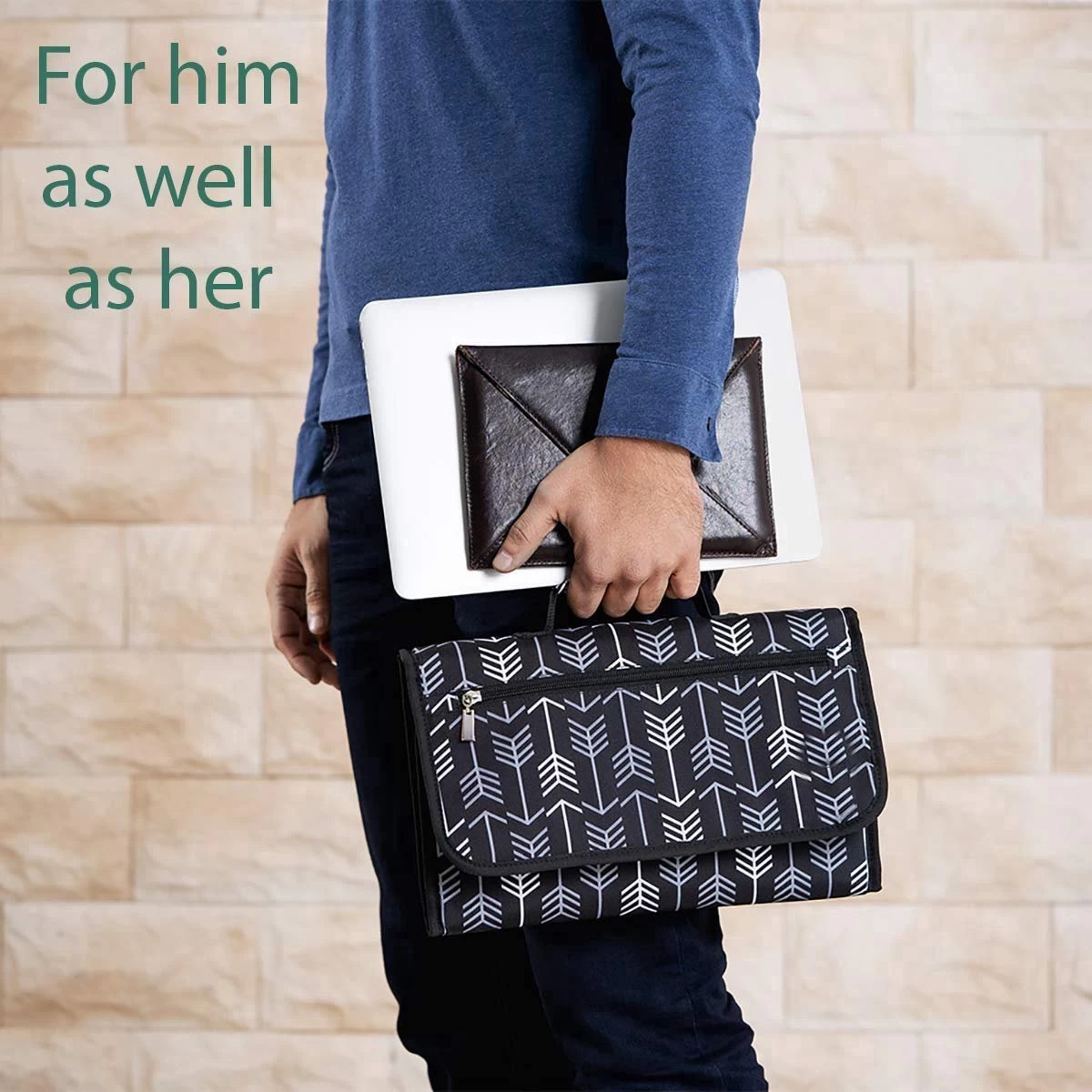 Een draagbaar aankleedkussen voor baby’s zal nooit een babytas vervangen, maar het luierkussen maakt het gemakkelijk om regelmatig te verwisselen. Pocket #1 bevat een volledige verpakking van 100 doekjes (elk merk), Pocket #2 bevat minimaal 5x luiers en Pocket met ritssluiting bevat crèmes en babyartikelen. En wanneer u de Babycommode opvouwt (zelfs wanneer deze gevuld is), blijven de items veilig. Zakken zijn 10×6 “elk.