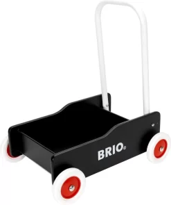 Prachtig afgewerkte zwarte loopwagen. De duwstang kan in 2 verschillende standen gezet worden. Zet deze rechtop voor het kind dat de eerste echte stapjes zet, en zet de stand iets schuiner voor kinderen die al iets beter kunnen lopen. Zo krijgen ze wat meer bewegingsvrijheid.