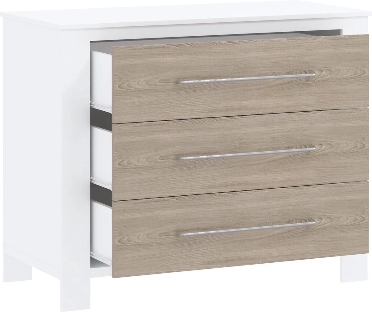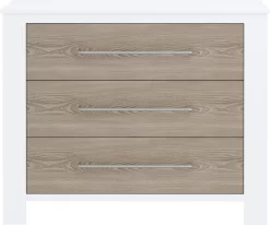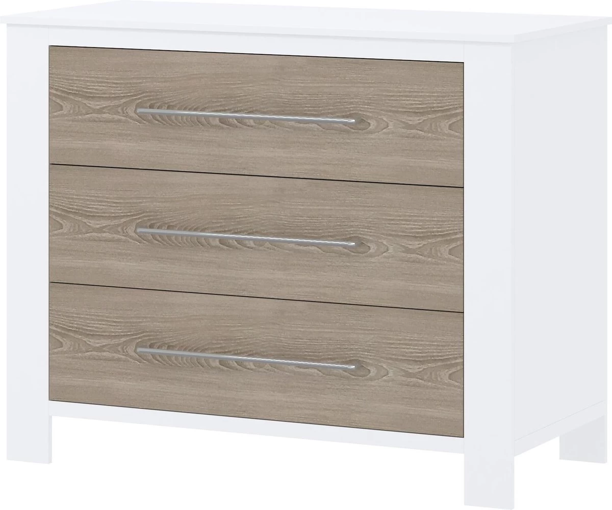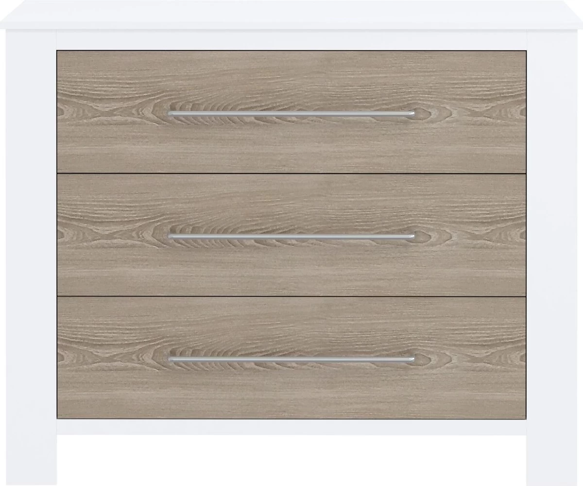 Cabino Babykamer Noel Wit & Grijs 3-delig is een prachtige 3 delige babykamer met een strakke uitstraling. Deze tijdloze babykamer past in iedere inrichting. Extra leuk detail zijn de brede zilveren handgrepen op commode en kledingkast, maar ook op het ledikant. Hier kan je dan bijvoorbeeld een muziekdoosje aan ophangen. Deze handgrepen zijn niet alleen stijlvol maar ook praktisch. Het openen van de lades en deuren gaat extra makkelijk!