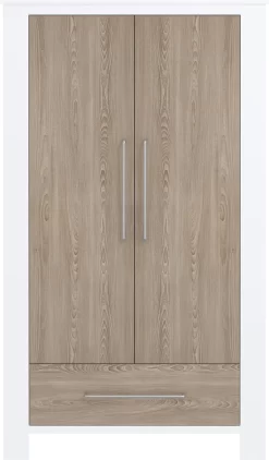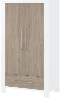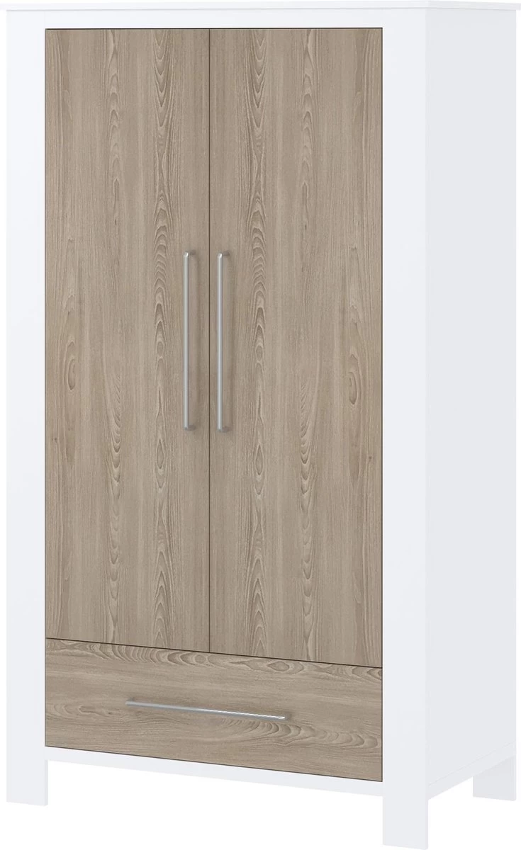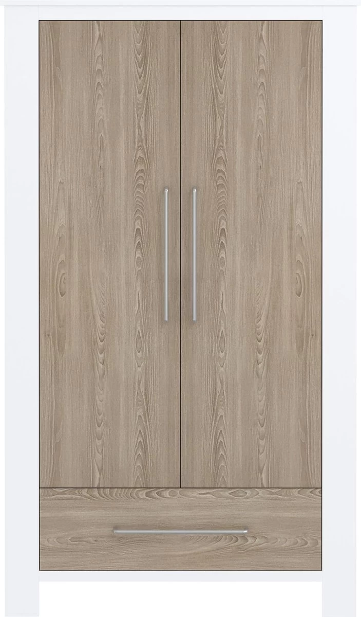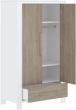 - De kledingkast heeft 2 deuren en 1 lade en is voorzien van een hang- en leggedeelte.