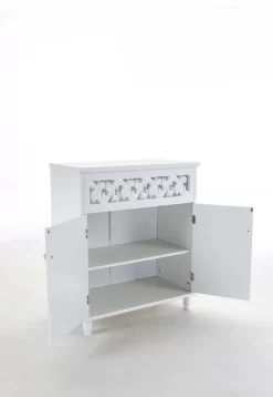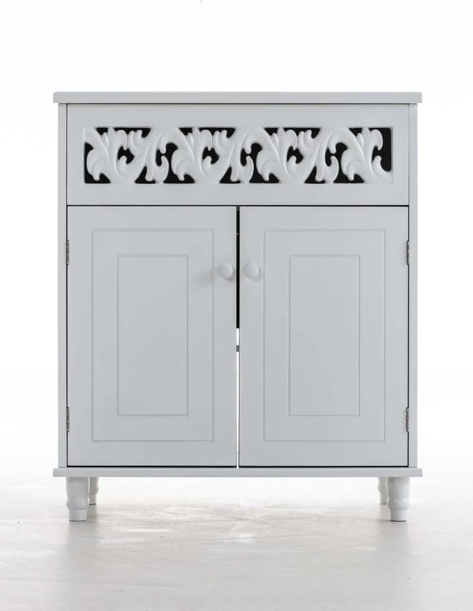 Deze romantische ladekast in vintage-stijl is een origineel en uniek meubelstuk dankzij de stucco-achtige decoratieve houten decoratie. Massieve houten poten garanderen absolute stabiliteit. De geïntegreerde plank aan de binnenkant biedt ook optimale opslagruimte op twee niveaus voor de opslag van uw persoonlijke bezittingen. Subtiele deurknoppen versieren bovendien de deuren en zorgen voor gemakkelijk openen en sluiten.