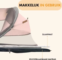 Inhoud: Reistent, zelfopblaasbaar matras (2,5 cm), draagtas, katoenen hoesje met rits.