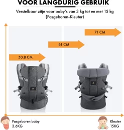 De draagzak is geschikt voor pasgeboren baby’s tot peuters. Het maximale gewicht voor deze draagzak is 15 kg.
