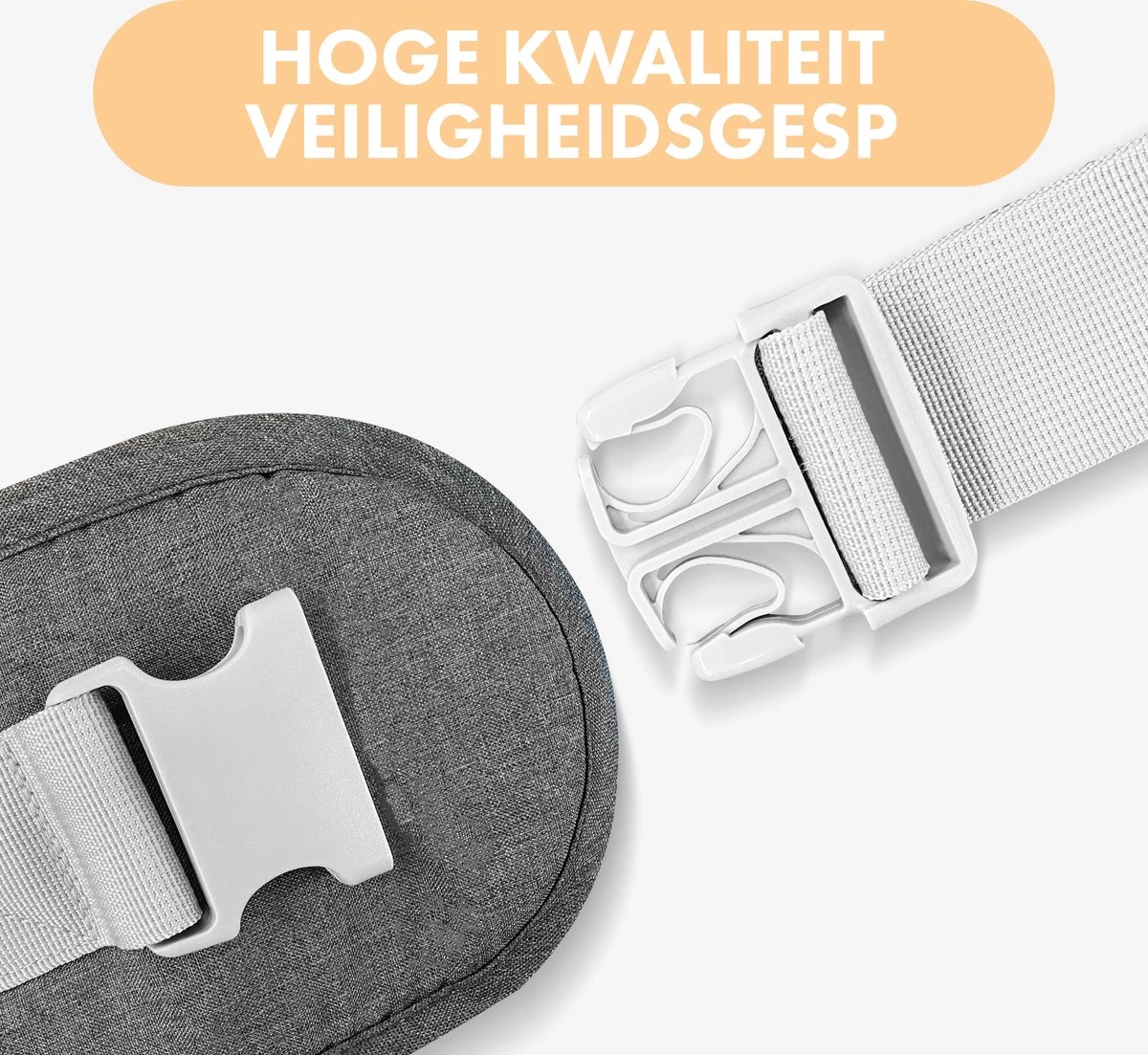 Kom je nog steeds handen te kort? Geen zorgen. Deze handige heupdrager beschikt namelijk ook over een handig tasje met genoeg opbergruimte voor accessoires! Een speen, doekjes of zelfs een telefoon kan hier in opgeborgen worden.