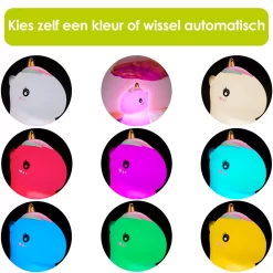Je kunt zelf kiezen welke kleur licht de eenhoorn geeft, maar vind je een rustig wisselende kleur fijner? Dan kan het nachtlampje ook zelf langzaam van kleur veranderen. Dit rustgevende effect helpt veel kinderen makkelijker inslapen.