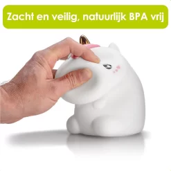 Het nachtlampje is gemaakt van zachte siliconen, natuurlijk BPA vrij zodat het lampje volledig veilig is voor je kleintje. Het kan dus geen kwaad om, bijvoorbeeld tijdens het voorlezen, het lampje op schoot of in bed te houden*. Je kindje kan ook gerust spelen met het lampje zonder zich te bezeren of het lampje kapot te maken.