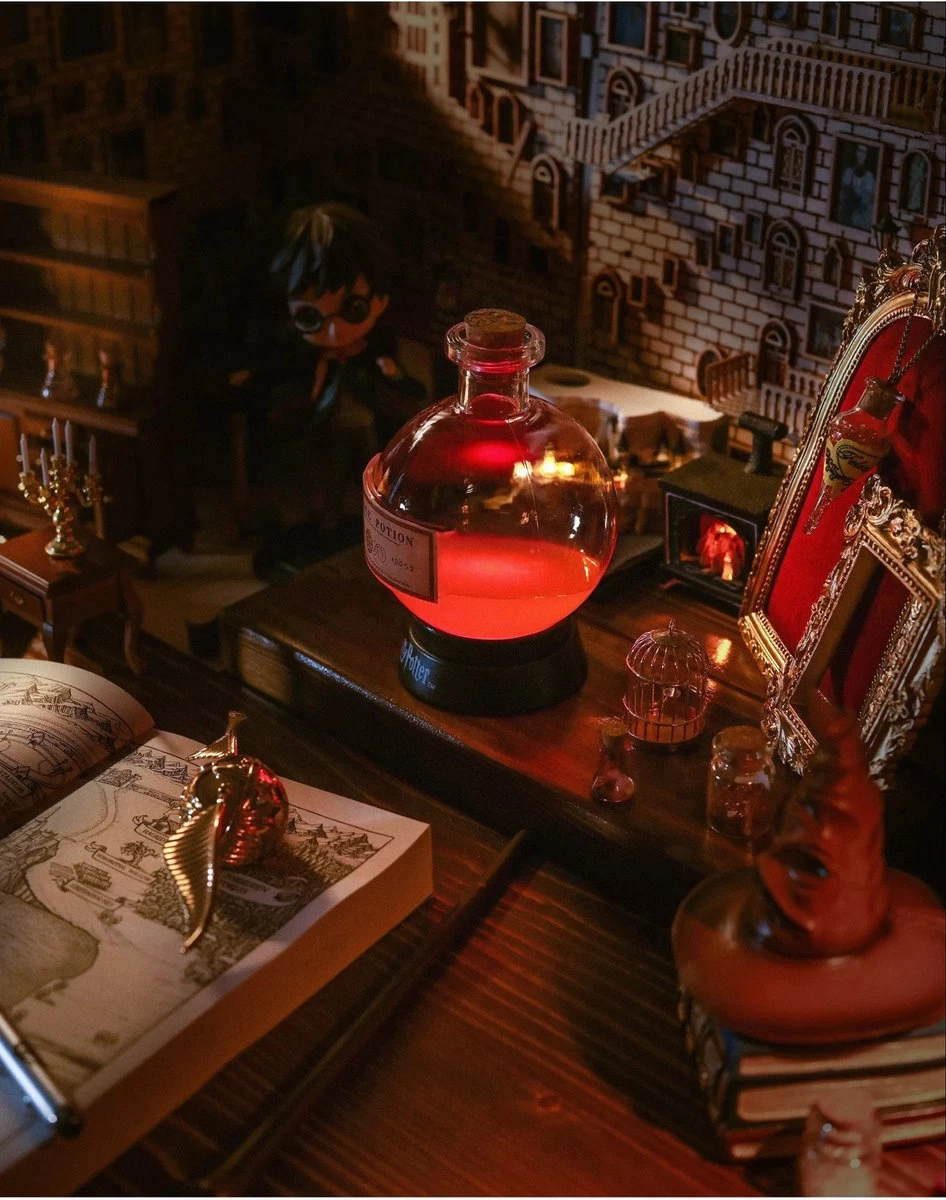 Potion lamp van Harry Potter. Moodlight in de vorm van een drankje dat wordt gebrouwen in een laboratoriumflesje. De lamp geeft licht in verschillende kleuren, die in elkaar overlopen. Deze grote variant van de Potion Light is 20 centimeter hoog. Hij werkt op 3 AA-batterijen (niet inbegrepen). Leuk om als nachtlampje te gebruiken.