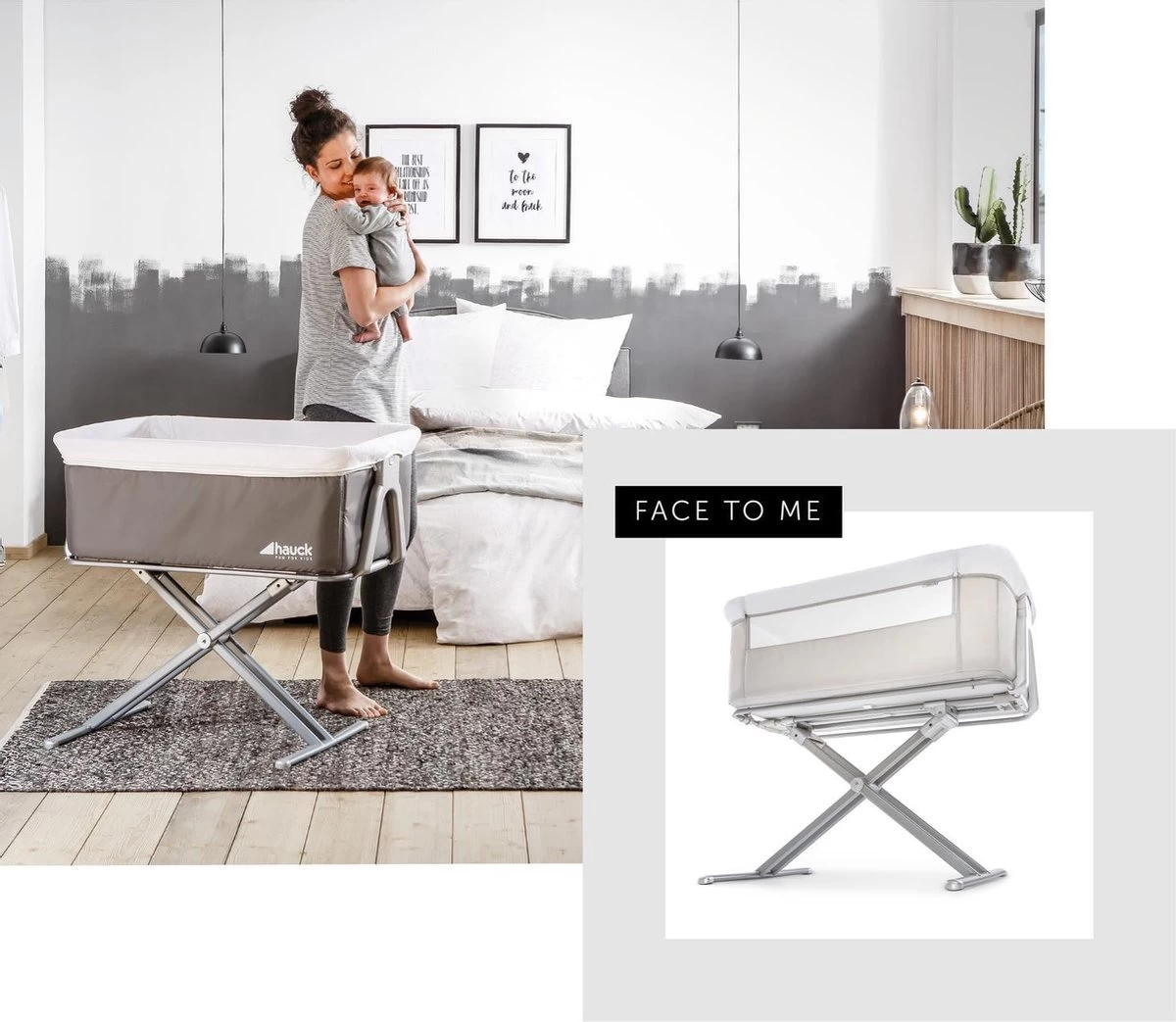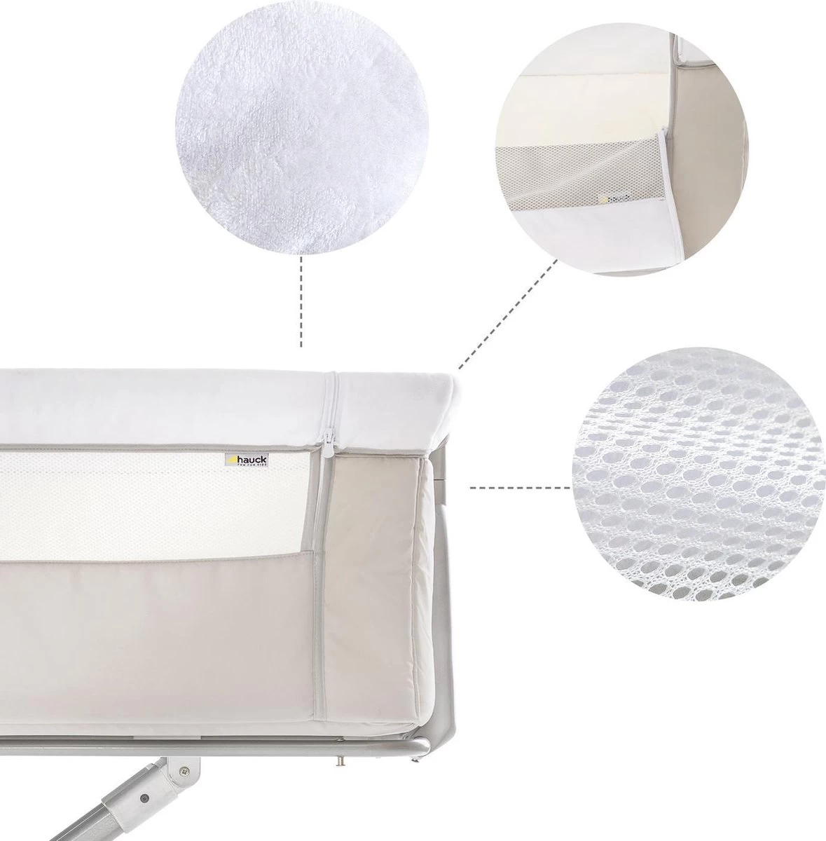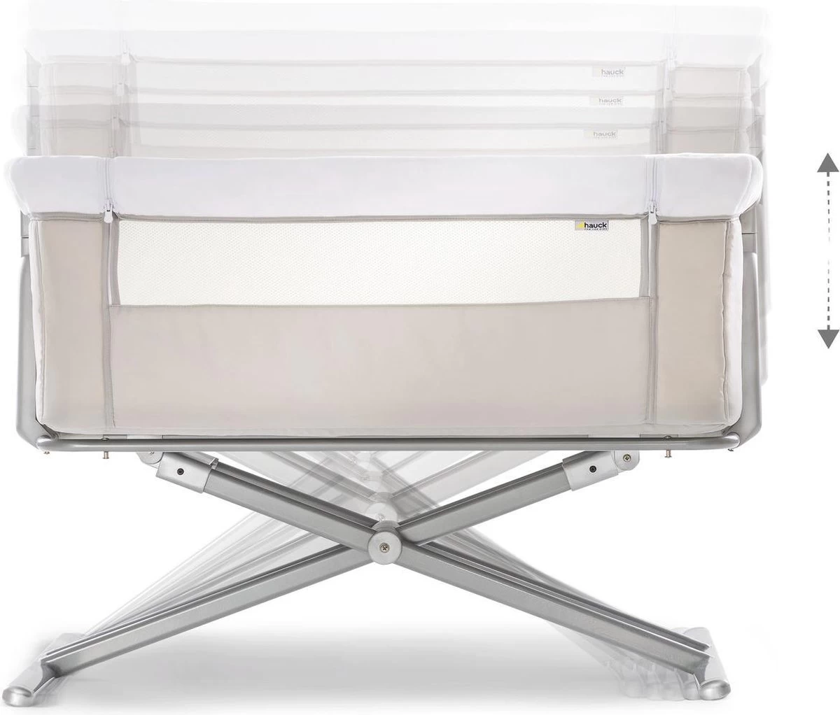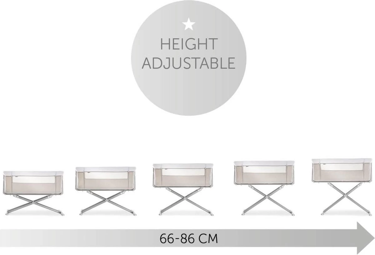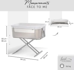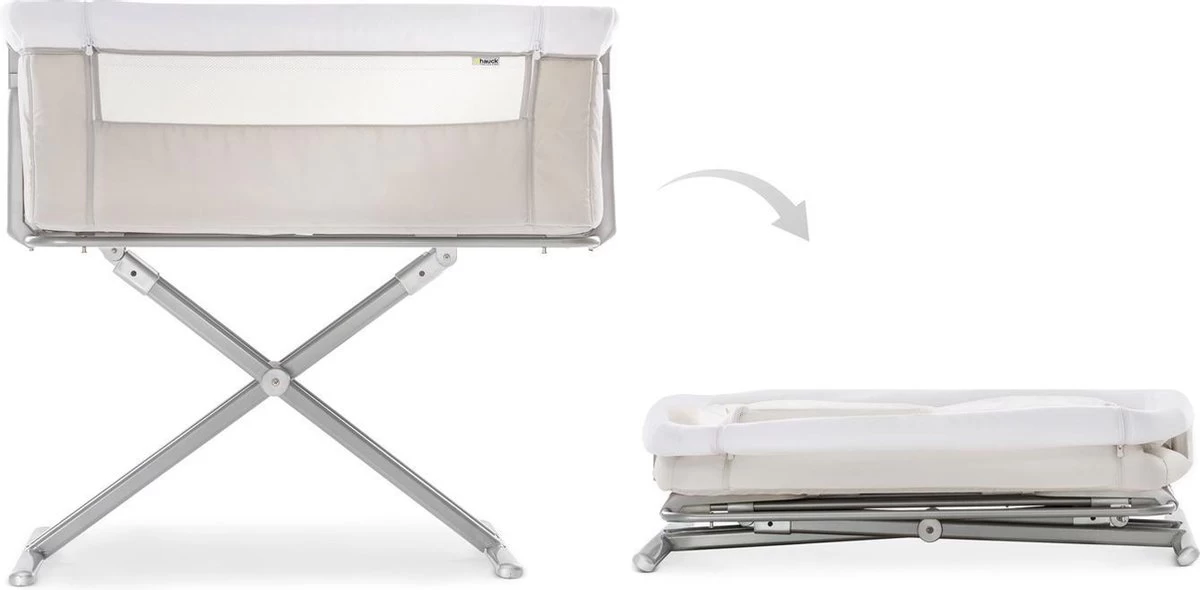 Hauck heeft het zeer praktische Face to Me campingbedje voor je pasgeboren baby voor direct naast je bed. Heel dichtbij elkaar zijn moeder en kind met deze inklapbare reiswieg. Doordat je het zijelement naar beneden kan schuiven, kan je eenvoudig je kleine uit de wieg halen om te voeden en weer terugleggen voor een zachte nachtrust. Je baby voelt jouw nabijheid, wat erg belangrijk is in de eerste maanden van de baby. De Face to Me van Hauck biedt maximale bewegingsvrijheid en optimaal comfort. Dit campingbedje kan je middels een bevestigingssysteem verbinden met het bed voor de volwassenen en het babywiegje voor extra veiligheid. En wat ook heel praktisch is is dat het campingbedje zeer compact kan worden ingeklapt met slechts enkele handelingen. Opmerking: de bovenrand van het neergelaten zijgedeelte moet zich altijd onder de matras van het volwassene bed bevinden.