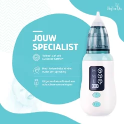 De elektrische neusreiniger van Hoy en Dia is speciaal ontworpen voor pasgeboren baby’s, peuters en kleuters tot 6 jaar. Dit houdt in dat de zuigkracht sterk genoeg is (maximaal 65Kpa) om het loslopende neusslijm te verwijderen en het geen kwaad kan doen aan een baby en kinderneusje. Wij garanderen u een veilig en hygiënisch artikel voor het reinigen van baby en kinderneusjes. Voor vragen staan wij altijd tot uw beschikking.