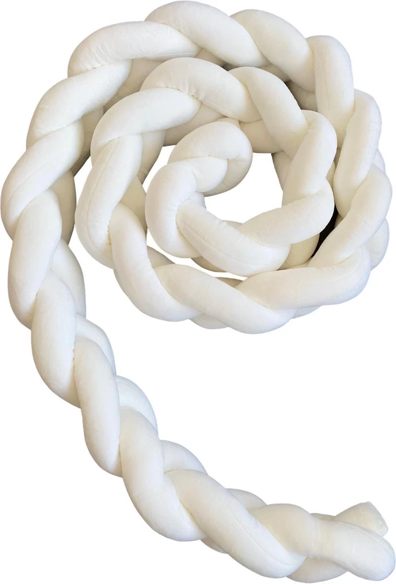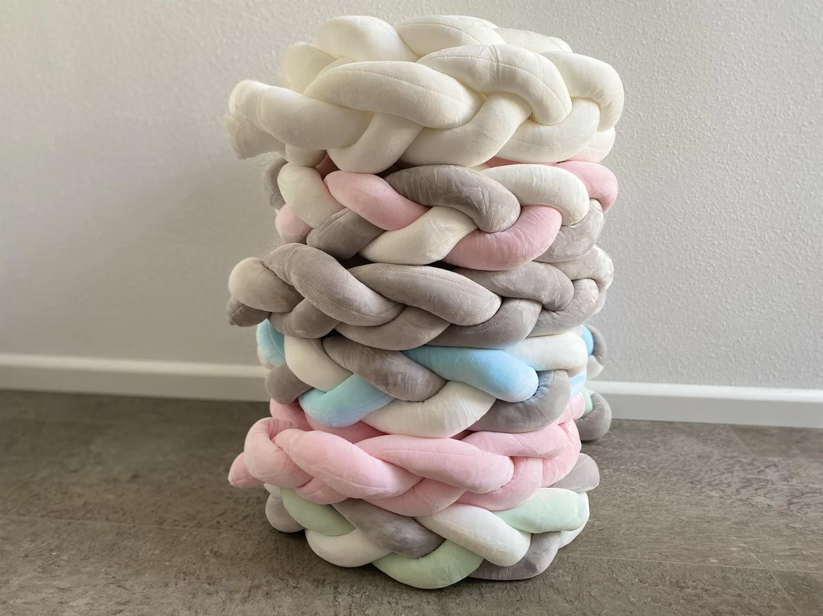 De gevlochten bedbumpers / bedomranders bestaat uit PP/katoen vulling. Dit materiaal is stevig, duurzaam en herbruikbaar. De buitenkant bestaat uit polyester en heeft een velours-look.