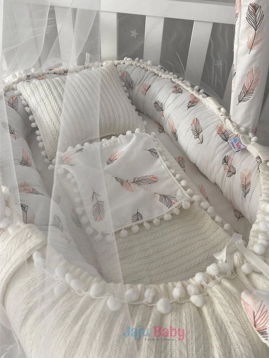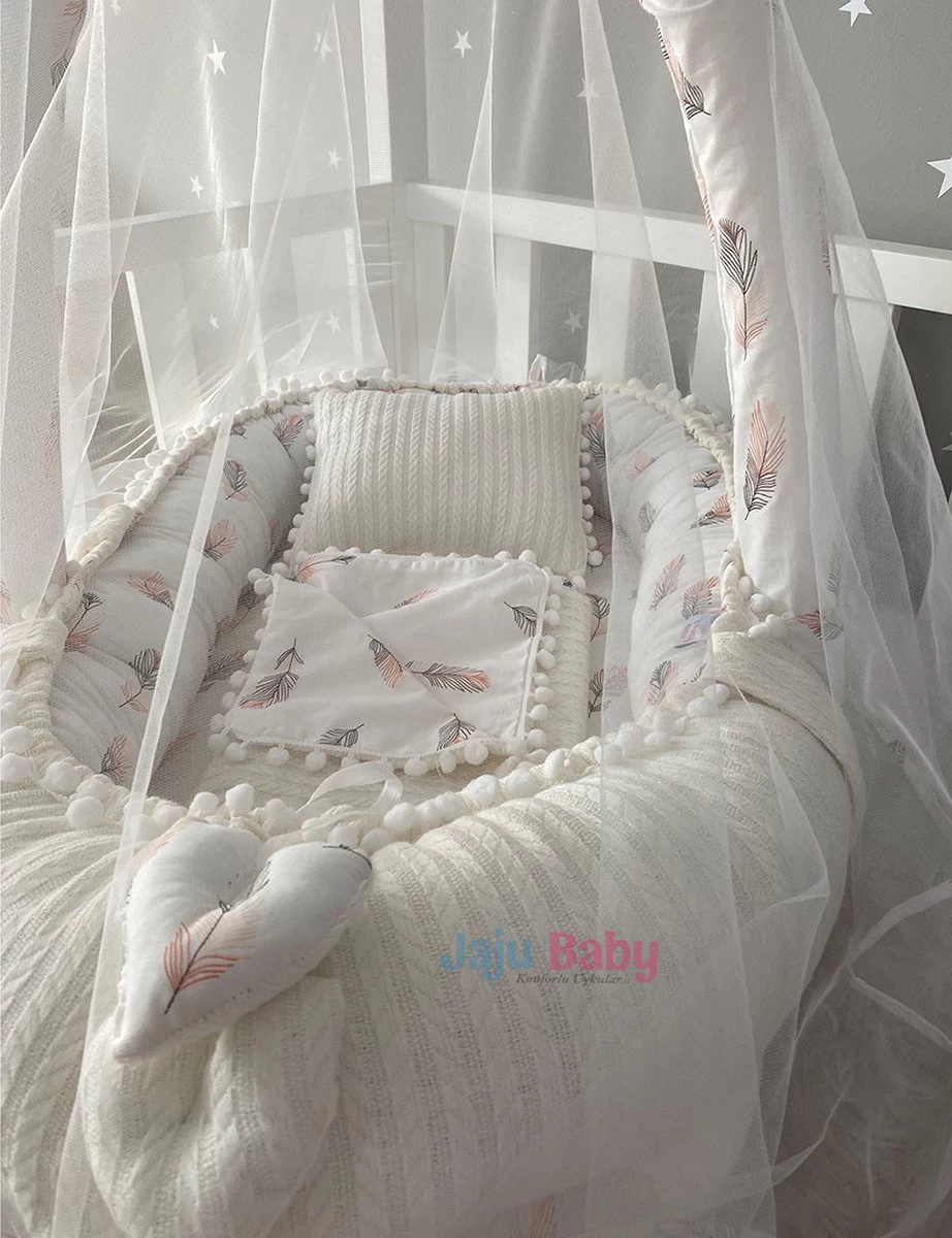Jaju Baby baby nest is specially designed for the development of the spine of babies. Produced from 100% organic cotton luxury fabric. Jaju Babynest is antibacterial and antiallergic. It has a zippered inner lining and is machine washable. Suitable for babies up to 2 years. Sponge and pearl fibres are used that absorb moisture and steam. It does not make the baby sweat.