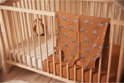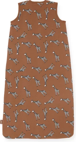 Deze slaapzak is verkrijgbaar in jeansblauw en caramel. Beiden uitgevoerd met een print van zwart witte giraffes.