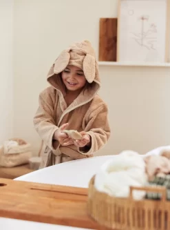 Een badstof badjasje is altijd handig voor jouw dreumes. De badjas is perfect om te gebruiken na het badderen, douchen of zwemmen. De zachte badstof neemt gemakkelijk water op en houdt daarmee jouw kleintje lekker warm. De vrolijke capuchon met oren droogt gemakkelijk de haartjes. Het badjasje is ook handig om mee te nemen op vakantie of mee naar een logeerpartijtje. Het badjasje heeft een handig drukknoopje om hem dicht te houden bij het dragen, elastiek in het rugpand voor de perfecte pasvorm en de ceintuur zit aan het badjasje vast zodat je hem niet kan verliezen.