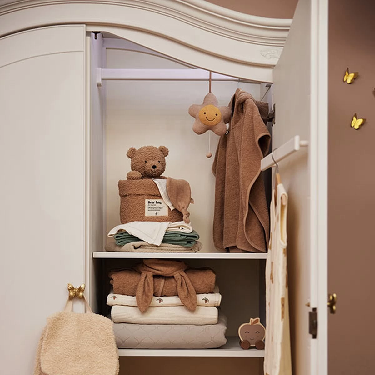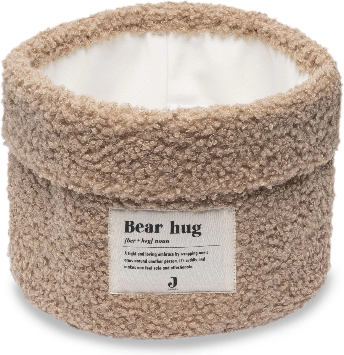 Praktisch mandje van zachte aaibare Bouclé stof om spulletjes in op te bergen. Het mandje is 14 cm hoog en heeft een diameter van 18 cm. Op de voorkant van het mandje vind je het leuke ‘bear-hug’ logo. Dit mandje is superhandig voor op de commode voor de kleine verzorgingsspulletjes zoals een manicuresetje, borsteltje en een thermometer. En tegelijkertijd een leuke accessoire om de babykamer net dat extra sfeer mee te geven. Met dit opbergmandje houdt je commode lades geordend. Een mandje voor sokjes, voor verzorgingsproducten en voor slofjes. Daarnaast staat dit ook nog een super leuk op de commode! Ook handig voor in de woonkamer voor klein speelgoed. Je combineert dit commodemandje ook heel leuk met de grote opbergmand Bouclé.