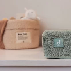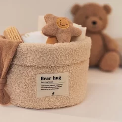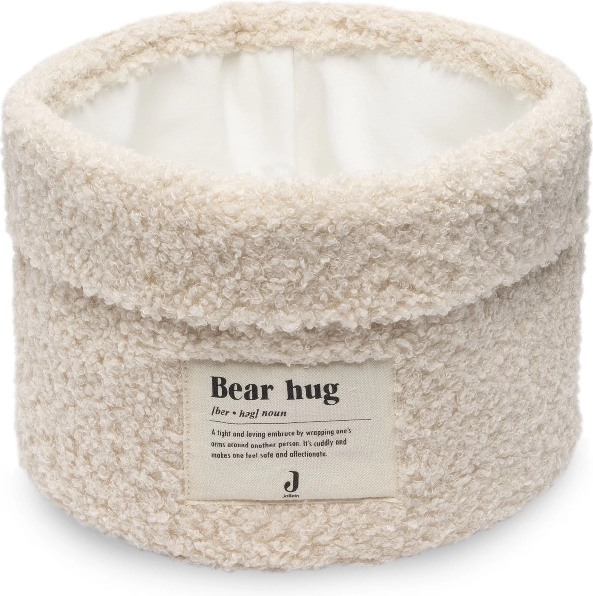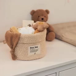 Praktisch mandje van zachte aaibare Bouclé stof om spulletjes in op te bergen. Het mandje is 14 cm hoog en heeft een diameter van 18 cm. Op de voorkant van het mandje vind je het leuke ‘bear-hug’ logo. Dit mandje is superhandig voor op de commode voor de kleine verzorgingsspulletjes zoals een manicuresetje, borsteltje en een thermometer. En tegelijkertijd een leuke accessoire om de babykamer net dat extra sfeer mee te geven. Met dit opbergmandje houdt je commode lades geordend. Een mandje voor sokjes, voor verzorgingsproducten en voor slofjes. Daarnaast staat dit ook nog een super leuk op de commode! Ook handig voor in de woonkamer voor klein speelgoed. Je combineert dit commodemandje ook heel leuk met de grote opbergmand Bouclé.
