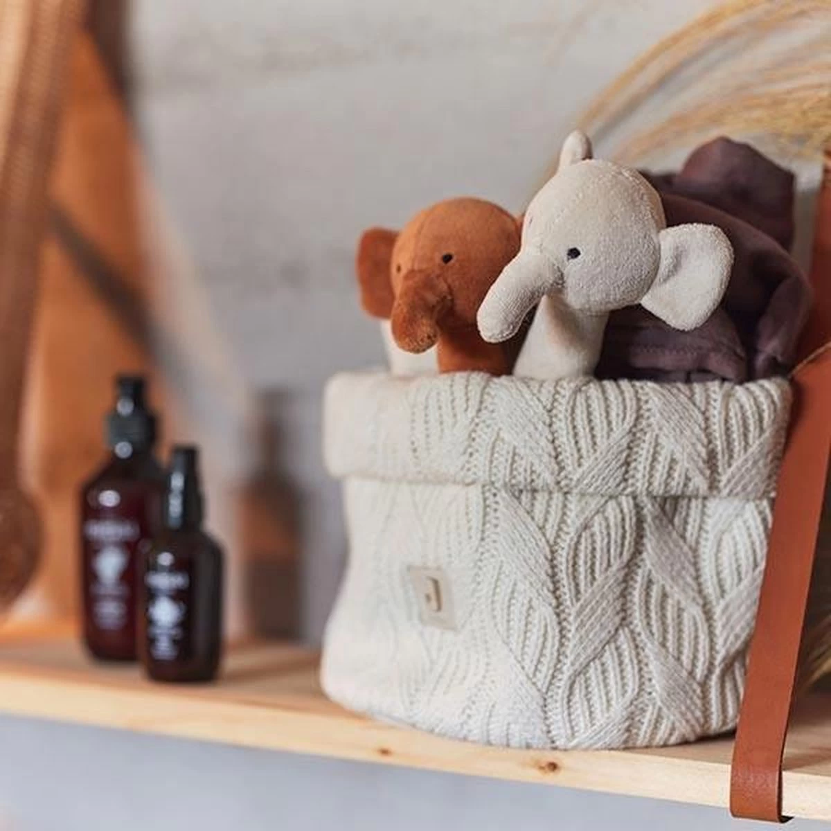 De gebreide stof in trendy kleur past in ieder interieur dus zet het gerust in de box of bij de bank met die extra luiers of monddoekjes voor het grijpen.