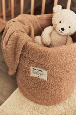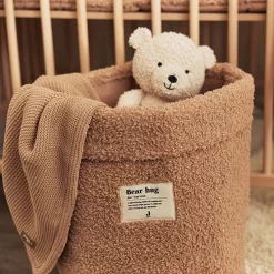Handig mandje voor op de baby kamer. Je kunt er allerlei spullen in bewaren zoals, speelgoed of luiers. Daarnaast staat dit ook nog eens leuk in de babykamer. Ook handig om te gebruiken in de woonkamer als opbergmand voor het speelgoed van je kleintje. De aaibare opbergmand is gemaakt van het zachte bouclé. Aan de voorkant het leuke ‘bear hug’ logo.
