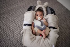 Deze omslagdoek is te gebruiken vanaf de geboorte. En ook heel handig te gebruiken in baby’s eerste autostoel. De gordels van de autostoel kun je door de openingen in de deken halen waardoor je baby lekker in de omslagdoek kan blijven zitten. Het is een universele wikkeldeken voor de Maxi Cosi en elk ander merk categorie 0 autostoeltje met drie of vijfpuntsgordel.