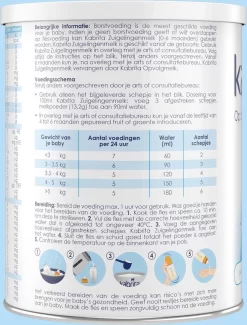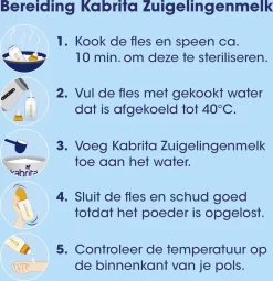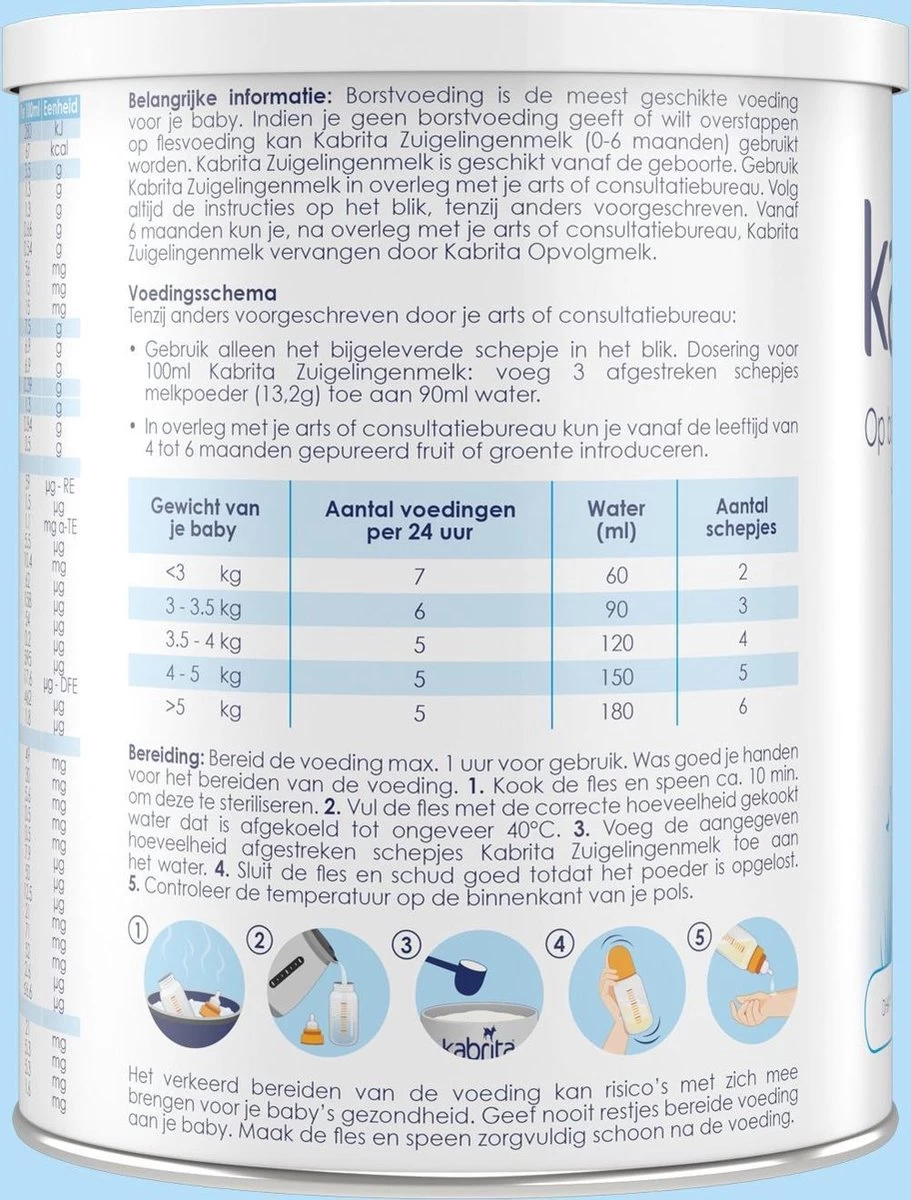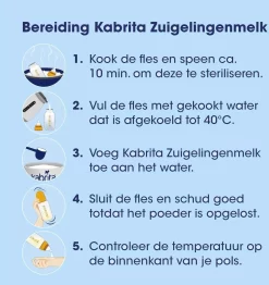 Borstvoeding is de beste voeding voor je baby. Lukt het niet (meer) om borstvoeding te geven of wil je het (deels) afbouwen, dan kan Kabrita Zuigelingenmelk (0-6 maanden) worden gebruikt vanaf de geboorte. Kabrita 1 Zuigelingenmelk wordt gemaakt van geitenmelk van hoge kwaliteit.