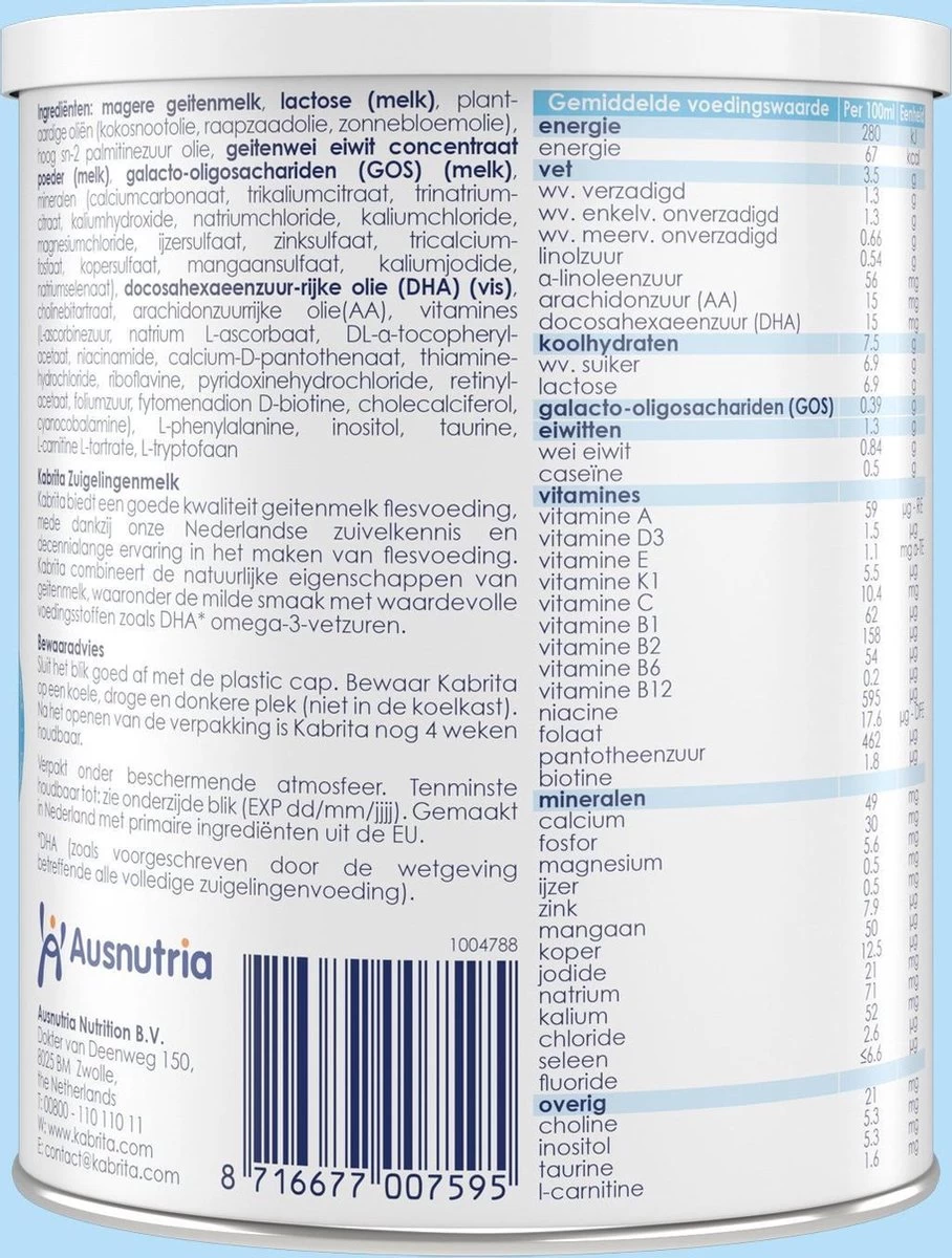 | Ingrediënten | Magere geitenmelk, lactose (melk), plantaardige oliën (kokosnootolie, raapzaadolie, zonnebloemolie), hoog sn-2 palmitinezuur olie, geitenwei eiwit concentraat poeder (melk), galacto-oligosachariden (GOS) (melk), mineralen (calciumcarbonaat, tricalciumfosfaat, trikaliumcitraat, trinatriumcitraat, natriumchloride, kaliumhydroxide, kaliumchloride, magnesiumchloride, ijzersulfaat, zinksulfaat, kopersulfaat, mangaansulfaat, kaliumjodide, natriumselenaat), docosahexaeenzuur-rijke olie (DHA) (vis), cholinebitartraat, arachidonzuur-rijke olie (AA), vitamines (natrium L-ascorbaat, L-ascorbinezuur, DL-α-tocopherylacetaat, niacinamide, calcium-D-pantothenaat, riboflavine, thiaminehydrochloride, retinylacetaat, pyridoxinehydrochloride, foliumzuur, fytomenadion, cholecalciferol, D-biotine, cyanocobalamine), L-phenylalanine, taurine, inositol, L-carnitine L-tartrate. |