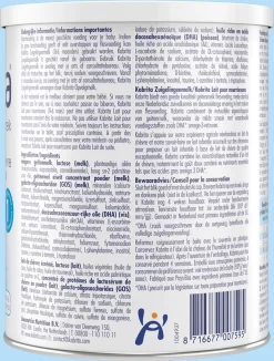 | Voedingswaarde | energie: 280kJ / vet: 3.5g / wv. verzadigd: 1.3g / wv. enkelv. onverzadigd: 1.3g / wv. meerv. onverzadigd: 0.66g / linolzuur: 0.54g / α-linoleenzuur: 56mg / arachidonzuur (AA): 15mg / docosahexaeenzuur (DHA): 15mg / koolhydraten: 7.5g / wv. suiker: 6.9g / lactose: 6.9g / galacto-oligosachariden (GOS): 0.39g / eiwitten: 1.3g / wei-eiwit: 0.84g / caseïne: 0.5g / vitamine A: 59μg – RE / vitamine D3: 1.5μg / vitamine E: 1.1mg α-TE / vitamine K1: 5.5μg / vitamine C: 10.4mg / vitamine B1: 62μg / vitamine B2:158μg / vitamine B6: 54μg / vitamine B12:0.2μg / niacine:595μg / folaat:17.6ug – DFE / pantotheenzuur:462μg / biotine:1.8μg / calcium:49mg / fosfor:30mg / magnesium:5.6mg / ijzer:0.5mg / zink:0.5mg / mangaan: 7.9μg / koper: 50μg / jodide: 12.5μg / natrium: 21mg / kalium:71mg / chloride:52mg / seleen:2.6μg / fluoride: ≤6.6μg |