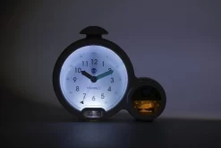 De klok heeft een analoge klok (met wijzers) en een digitale klok, zodat je kind op alle manieren de tijd leert lezen. De klok is tevens als wekker te gebruiken, waarbij gekozen kan worden uit drie weksignalen: trein, koekoek of vogelgezang. Met een knop om te ‘snoozen’ en de klok te verlichten.