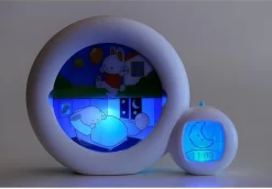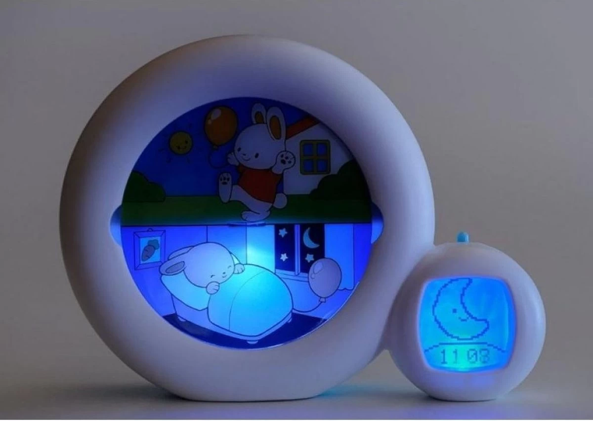 Nieuw is dat de zon en de maan langzaam ondergaan. Dit geeft je kind een indicatie hoe lang het nog duurt voordat het bedtijd is en hoe lang het nog duurt om op te mogen staan.