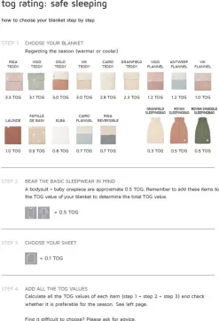 Wij snappen dat het lastig kan zijn om te bepalen welke deken je nu het beste kunt kopen. De juiste keuze hangt af van een aantal factoren en daarom heeft Koeka een keuzehulp samengesteld om je op weg te helpen. Deze “How to choose your blanket” keuzehulp vind je tussen de afbeeldingen. Meet de kamertemperatuur van je kinderkamer en bepaal wat de TOG waarde is van de slaapzak, pyjama en lakentje (als je die gebruikt). Raadpleeg daarna de keuzehulp om te bepalen wat het advies is voor de minimale en maximale TOG waarde van je deken.