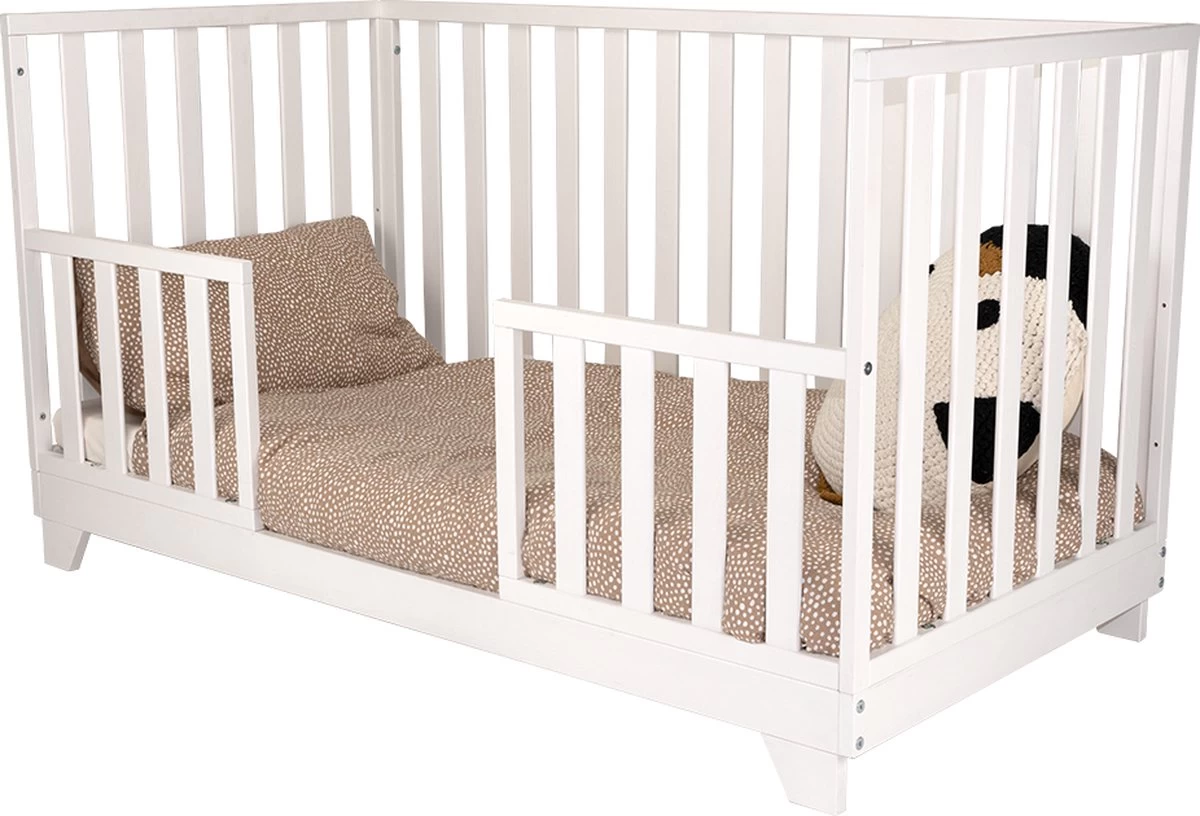 Uiteindelijn wordt je kindje natuurlijk te groot voor het ledikant waardoor dit bedje met jouw kindje mee groeit. Zo heb je de mogelijkheid om uiteindelijk één zijde van het ledikant te vervangen voor twee bedhekjes. Hierdoor kan je kindje niet uit bed vallen maar wel vast beginnen met oefenen voor het in en uit bed stappen. Wanneer dit goed gaat is het mogelijk om geen bedhekjes te gebruiken waardoor het ledikant een bedbank-model krijgt. Word je kindje echt te oud voor een ledikant? Bouw het bedje dan gemakkelijk om naar een peuterbedje zonder hoge zijde. Ondanks het ombouwen van het bed blijft de matrasmaat altijd gelijk aan de 70×140. Hierdoor hoef je niet steeds het matras te vervangen of de lattenbodem.