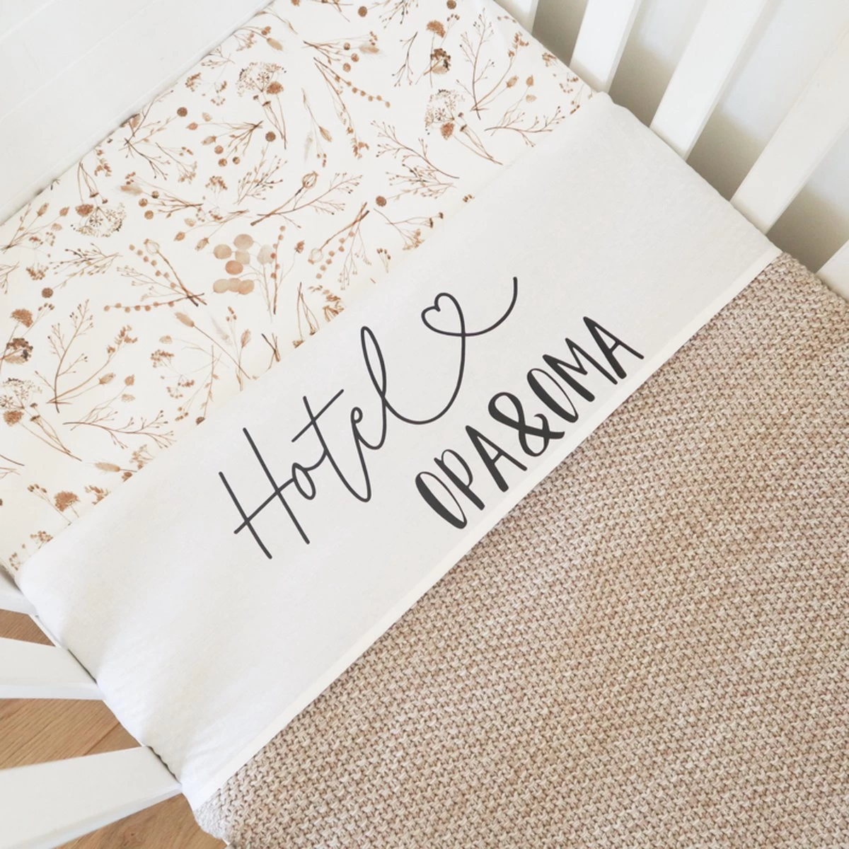 Lekker slapen bij Opa&Oma onder dit ledikantlaken. Dit lakentje is bedrukt met de tekst ‘Hotel Opa&Oma’. Je vindt de bedrukking op de omslag.