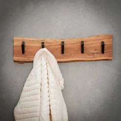 Deze kapstok is uitgevoerd in 5 haaks en massief acacia hout met een dikte van maar liefst 38 millimeter. Het model is in de kleur bruin / acacia naturel. Het zorgvuldig geselecteerde hout is voorzien van verschillende noesten en een fijne nerf, verwerkt op een ambachtelijke wijze. Hierdoor heeft de kapstok een erg unieke look en een natuurlijke finish. Dit model bevat in totaal 5 of 8 diverse ophang mogelijkheden. De haakjes zijn rond en van zwart geschuurd metaal. Op de achterkant van de kapstok zitten twee bevestigingsogen. Perfect in meerdere woonstijlen.