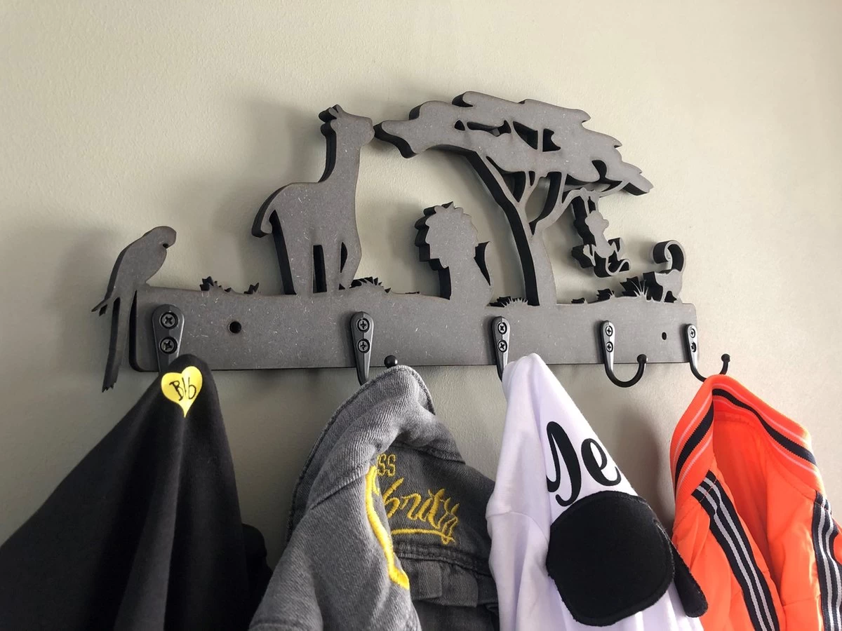 De kinderkapstok is gemaakt van 9mm zwart MDF met afgeronde haakjes en vormen voor de kindvriendelijkheid. Het product is op te hangen met behulp van twee meegeleverde schroeven en twee pluggen.