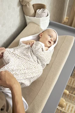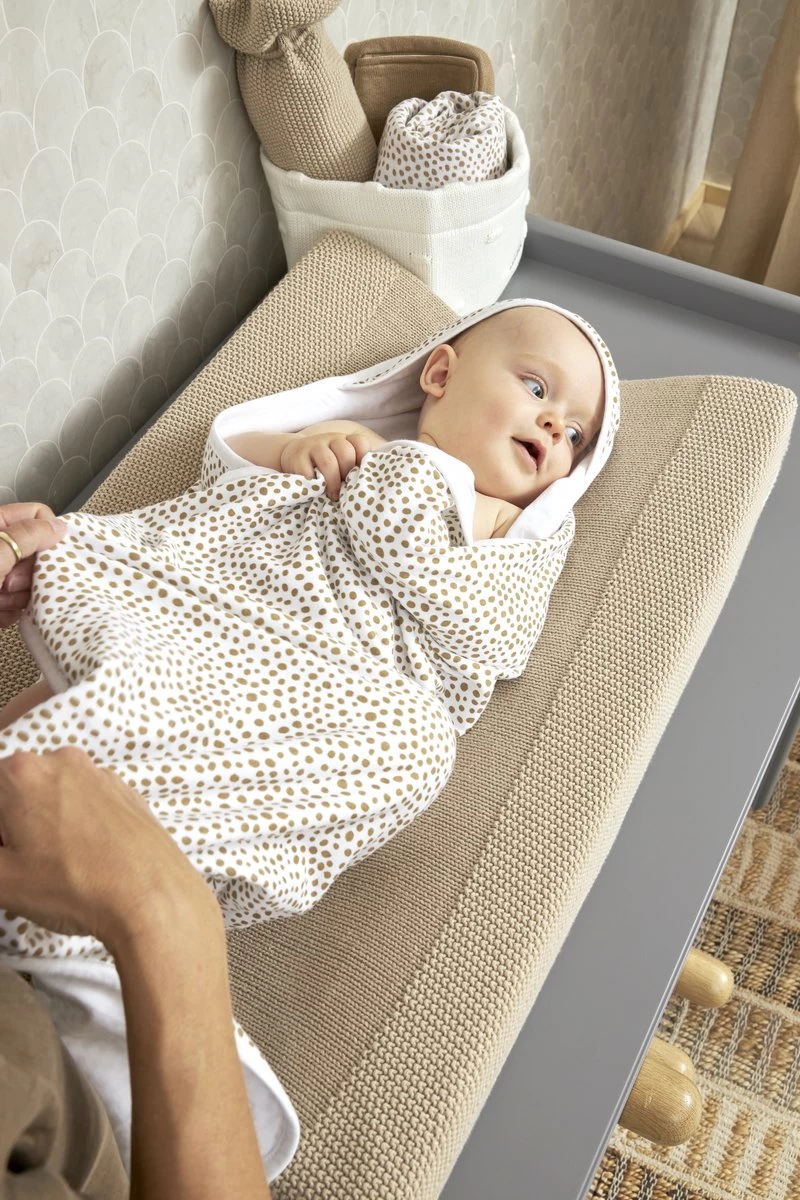 De commodemand is verkrijgbaar in diverse kleuren en in een small en medium variant met de afmetingen: small 21x16xh16 cm en medium 26x19xh16 cm. De binnenkant kun je afnemen met een vochtig doekje. Dus mocht er een flesje of potje lekken dan is er niets aan de hand en maak je het zo weer schoon. Mix en match het mandje met de rest van de Meyco Baby collectie en creëer een complete look in de babyslaapkamer.
