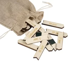 – Tekst: De tekst is in het hout gelaserd.