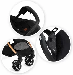 De wagen is voorzien van een ruime zonnekap die je kindje beschermd tegen verschillende weersomstandigheden. De kap heeft een kijkluikje, zodat je je kindje altijd kunt zien. Dankzij de 5-punts veiligheidsgordel en de valbeugel zit je kindje altijd veilig in de wagen. De handvaten zijn stijlvol afgewerkt met eco-leer. Tevens heeft de wagen een ruime boodschappenmand waar je de nodige spulletjes in op kunt bergen.