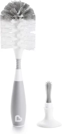 Zuigflessen schoon houden is essentieel voor uw baby’s gezondheid. Maar laten we wel wezen, bacteriën voelen zich uitstekend thuis in de keuken, en flessen reinigen hoort er nu eenmaal bij. Nu is er een slimme manier om uw betrouwbare flessenreiniger bacterievrij te houden.De Munchkin Deluxe Flessenborstel is uitgerust met een gepatenteerde zuignap. Wanneer u klaar bent met schrobben, kunt u de borstel gewoon recht op het aanrecht plaatsen. Zo droogt hij snel en worden bacteriën op veilige afstand gehouden. De antislipsteel biedt een betere grip voor ingezeepte handen. De duurzame nylon borstelharen rekenen streng af met vuil, maar zijn zacht voor baby’s flesjes.Bovendien is er een handige speenborstel opgeborgen in de steel, waardoor deze borstel ook geschikt is voor het reinigen van afkolfonderdelen, kleppen en andere kleine flesaccessoires. Met de Deluxe Flessenborstel Brush gebeurt flessen reinigen altijd hygiënisch en zonder kopzorgen. Zo hoeft u zich alleen druk te maken over alle flesonderdelen, potten en pannen die zich opstapelen, maar niet over het onzichtbare vuil.