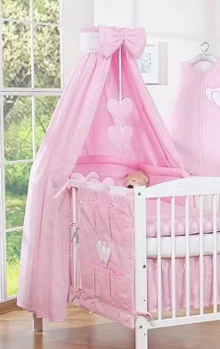 Prachtige sluier van 100% katoen in de kleur roze. Geeft de babykamer een romantische look. De set bestaat uit 4 delen een sluier, een stijlvolle gewatteerde strik, een deko hanger met hartjes & incl. een sluierstang.