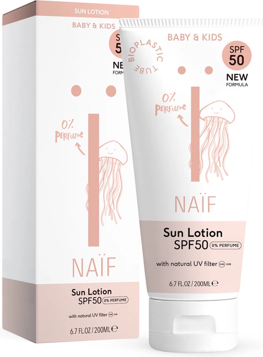 De Naïf Zonnebrand Lotion Parfumvrij voor Baby & Kids, op basis van zinkoxide (non-nano). Zonder inwerktijd, minimale kans op huidirritatie. Ook fijn: deze lotion is vrij van parfum. Dat maakt ‘m éxtra geschikt voor de éxtra gevoelige babyhuid.