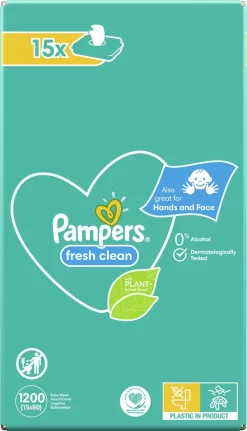 Pampers Fresh Clean babydoekjes bevatten een verfrissende lotion die jij en je baby heerlijk zullen vinden. Bovendien zorgt de lotion ervoor dat de natuurlijke pH-waarde van je baby’s huidje bij elk gebruik bewaard blijft.
