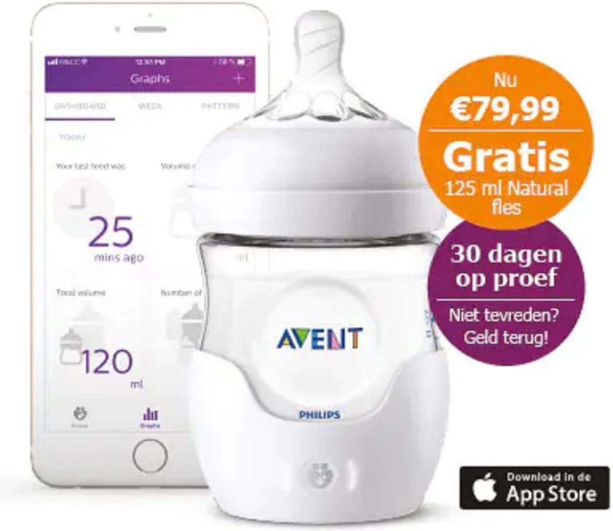 De slimme babyfles-app* is je persoonlijke assistent. Hij onthoudt alle belangrijke gegevens zodat je snel en nauwkeurig kunt controleren of je baby genoeg drinkt. Door de duidelijke grafieken houd je overzicht en met de gepersonaliseerde inzichten leer je de voedingsgewoonten van je baby beter kennen.