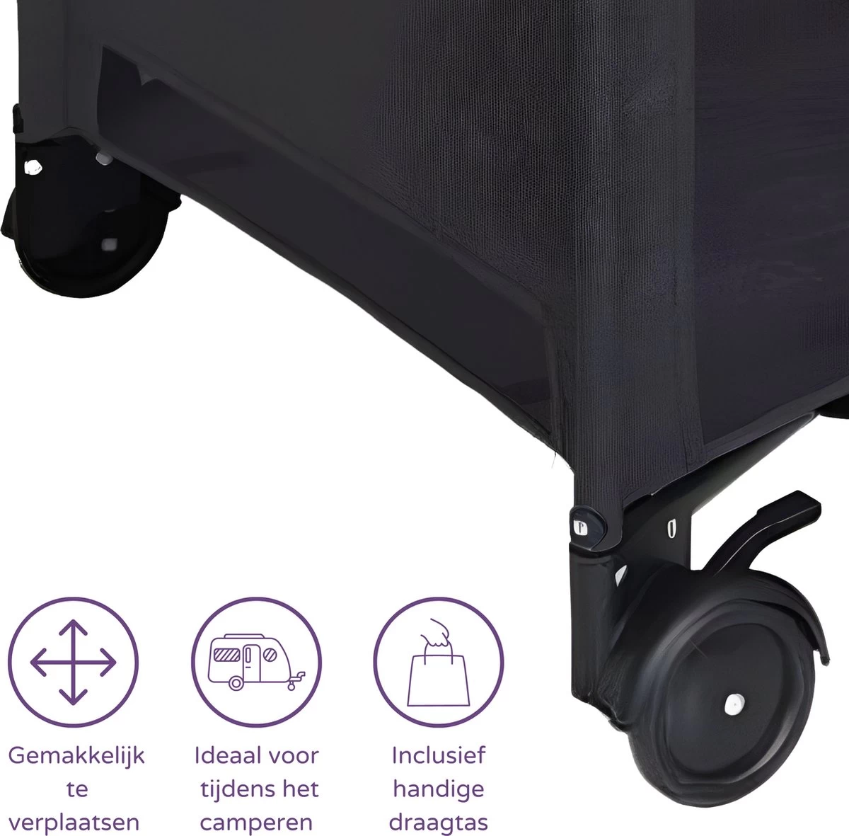 Het campingbed is gemakkelijk en compact op te vouwen, zo is het handig voor onderweg. Dankzij de lange zijdes met gaas kan je kindje rondkijken vanuit het campingbed. Tevens zorgt het gaas voor een goede luchtcirculatie in het campingbed. De afmetingen van dit campingbedje zijn 120 x 60 cm.