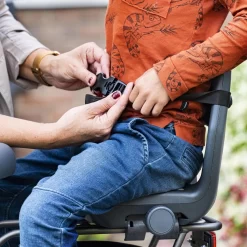 Het Qibbel 6+ Junior zitje is voorzien van een veiligheidsgordel en inklapbare voetsteunen.