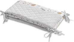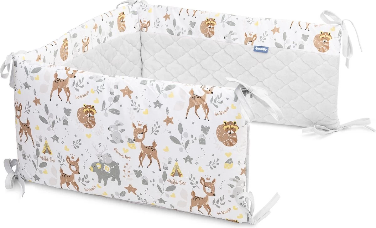 De bedbumper van Sensillo Baby is een perfecte aanvulling op de babyuitzet. De wattenvulling beschermt het kind tegen verwondingen tijdens het bewegen rond het bed en scheidt zich van de koude muur, de mooie materialen versieren de babykamer. De ene kant van de beschermer is gemaakt van zacht katoen met een print en de andere kant is van hoogwaardig, zacht aanvoelend pluche. Doormiddel van koort bevestigingen wordt de bumper in de juiste positie gehouden. De bedbumper is ontworpen voor een bed met een afmeting van 120×60 cm.
